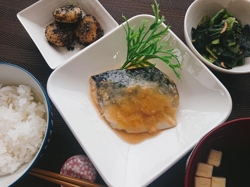 ごはん、すまし汁、さばの味噌煮、青梗菜の塩炒め、いももちの胡麻よごし