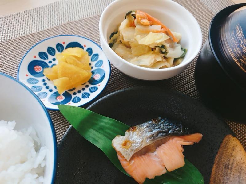 ごはん、みそ汁、鮭の塩焼き、キャベツの味噌炒め、つぼ漬け