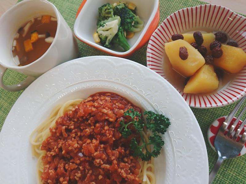 ミートスパゲッティ、コンソメスープ、さつま芋のレモン煮、フレンチサラダ