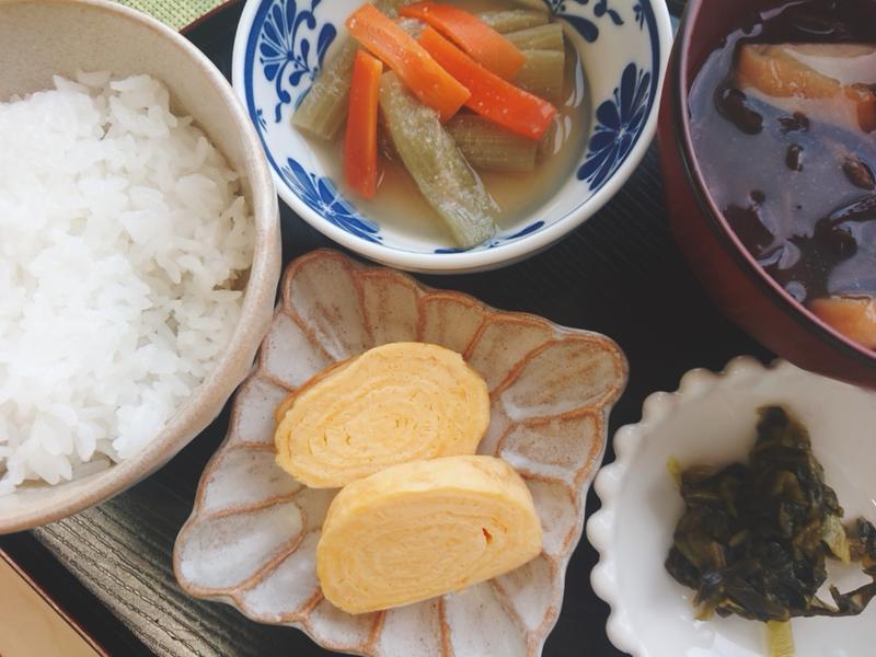 ごはん、みそ汁、厚焼き玉子、ふきの煮物(みそ)、高菜漬け