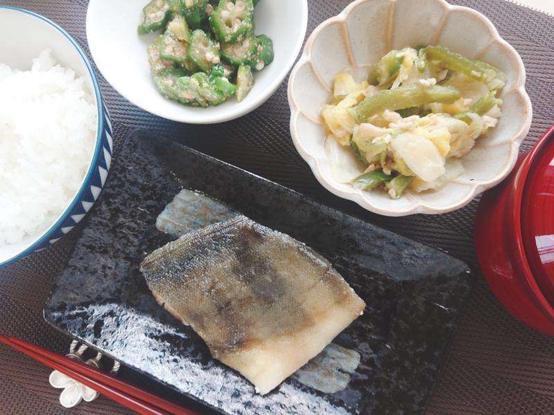 ごはん、みそ汁、ほっけの塩焼き、白菜の辛みそ炒め、おくらの胡麻酢和え