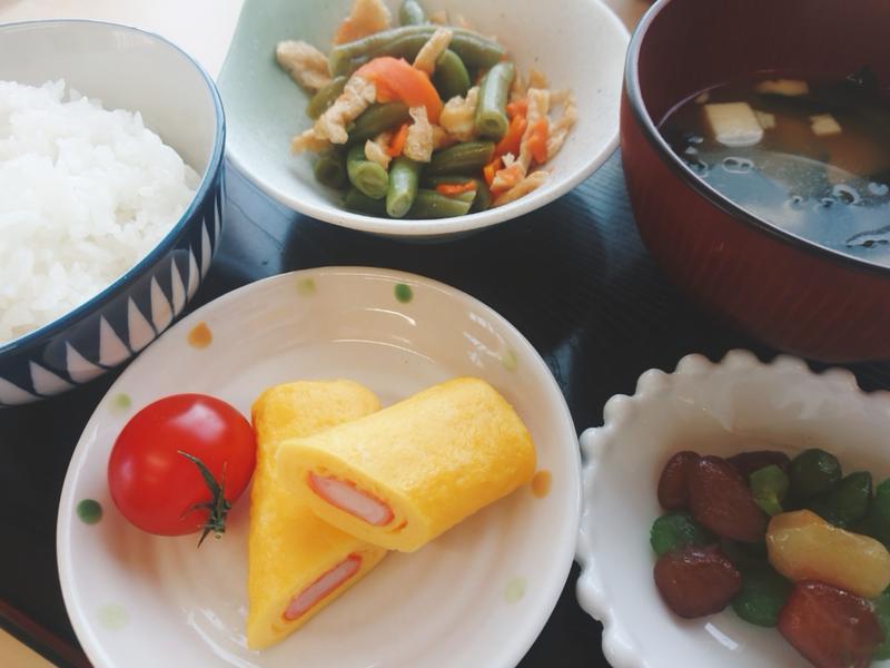 ごはん、みそ汁、かにかまロール、いんげんときざみ揚げの炒め煮、三色豆