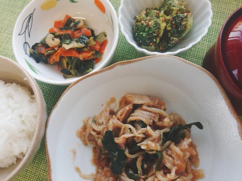 ごはん、みそ汁、牛カルビ炒め、中華旨煮(青梗菜)、ブロッコリーの粒マスタード和え