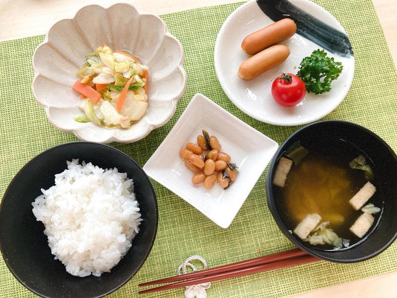 ごはん、みそ汁、あらびきウインナー、白菜の塩炒め、豆昆布