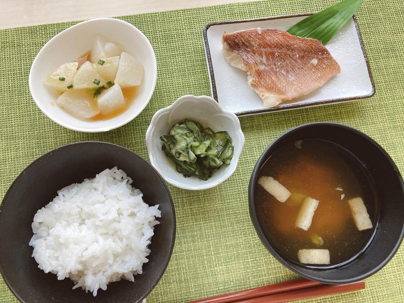 ごはん、みそ汁、赤魚の粕漬け、ふろふき大根、胡瓜の梅肉和え