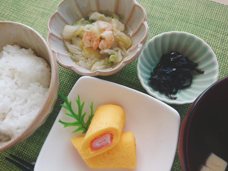 ごはん、みそ汁、かにかまロール、白菜と海老の塩煮、しそ昆布