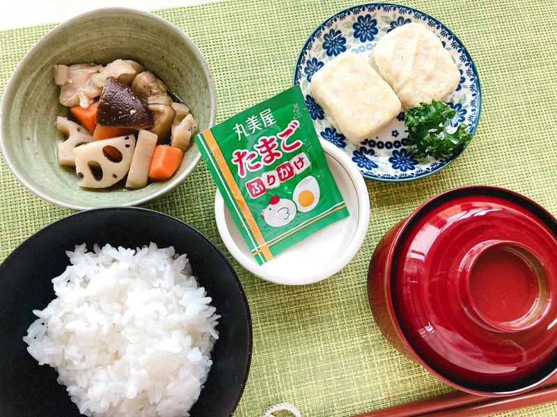 ごはん、みそ汁、豆腐ナゲット、筑前煮、ふりかけ(たまご)
