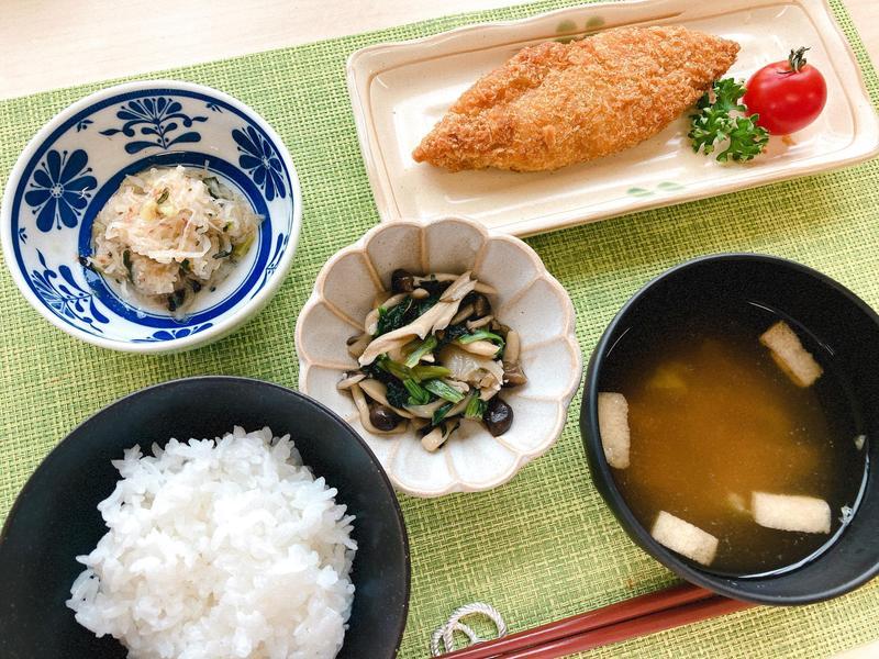 ごはん、みそ汁、白身魚のフライ、きのこの醤油炒め、大根のさっぱり和え