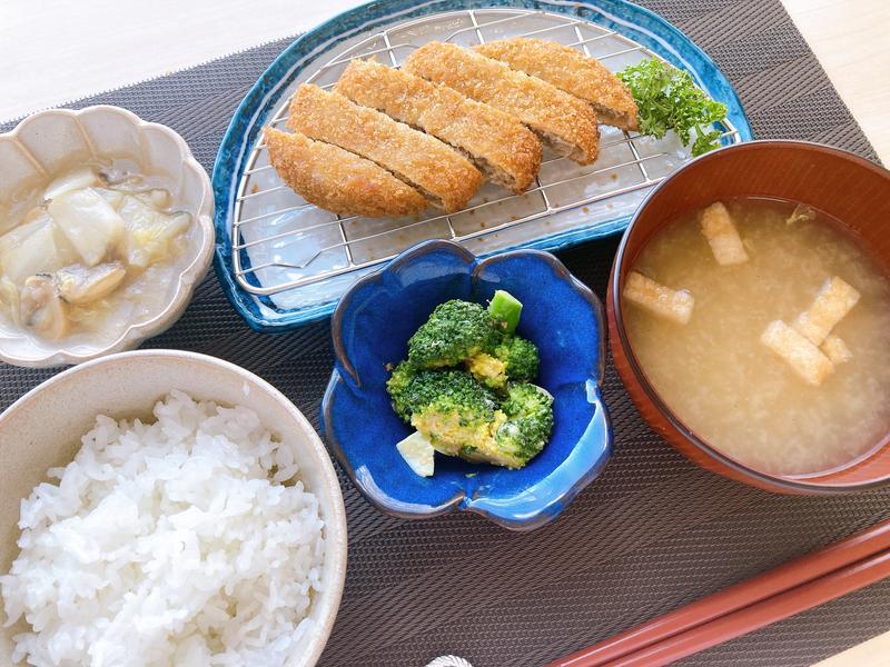 ごはん、みそ汁、メンチカツ、白菜のあさりあんかけ、ブロッコリーのおかかマヨ和え