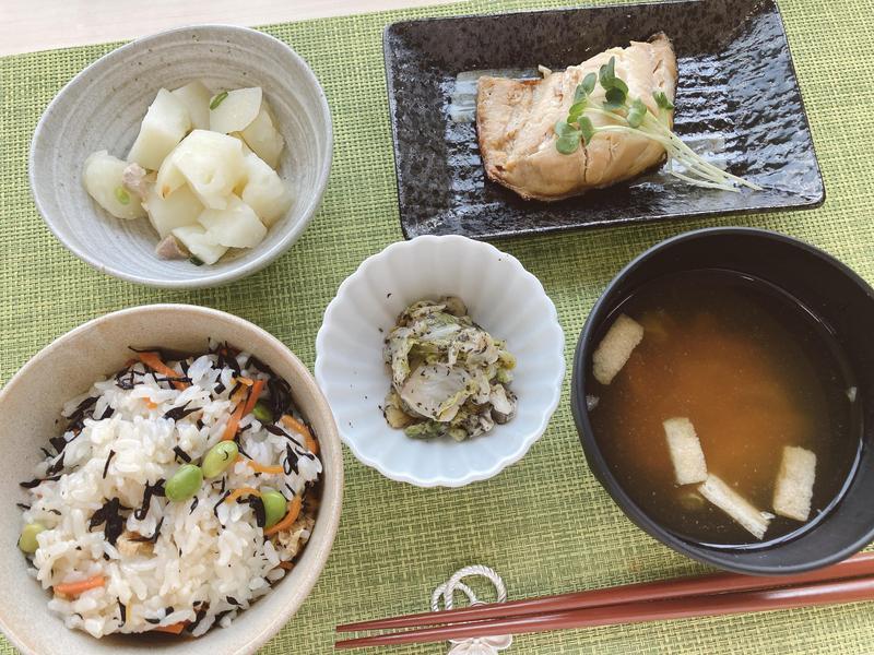 ひじきご飯、みそ汁、ほっけのみりん焼き、じゃが芋と鶏肉の塩煮、白菜のゆかり和え