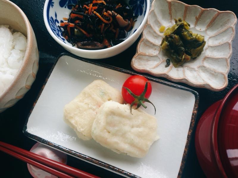 ごはん、みそ汁、豆腐ナゲット、ひじきの煮物、高菜漬け