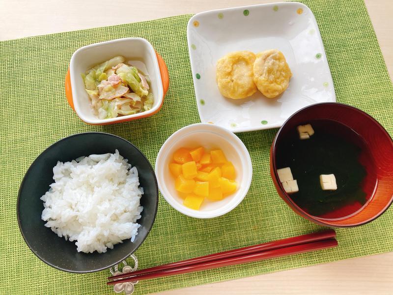 ごはん、みそ汁、チキンナゲット、キャベツとベーコンのコンソメ煮、桃のシロップ漬け