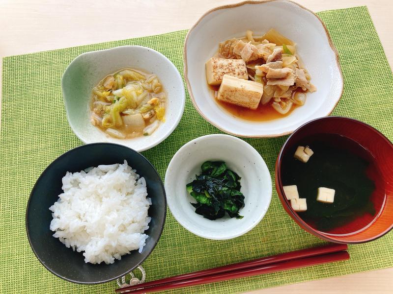 ごはん、みそ汁、肉豆腐、白菜のあさりあんかけ、胡瓜の酢の物
