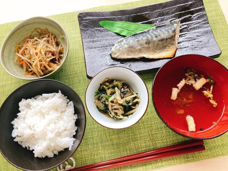 ごはん、すまし汁、鯖の柚子みそ焼き、金平ごぼう、和風サラダ